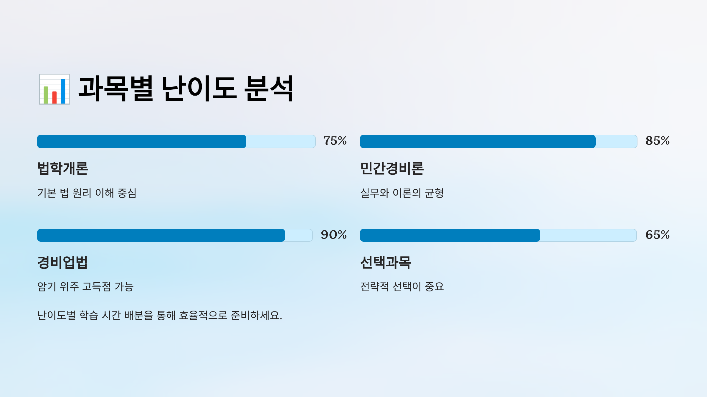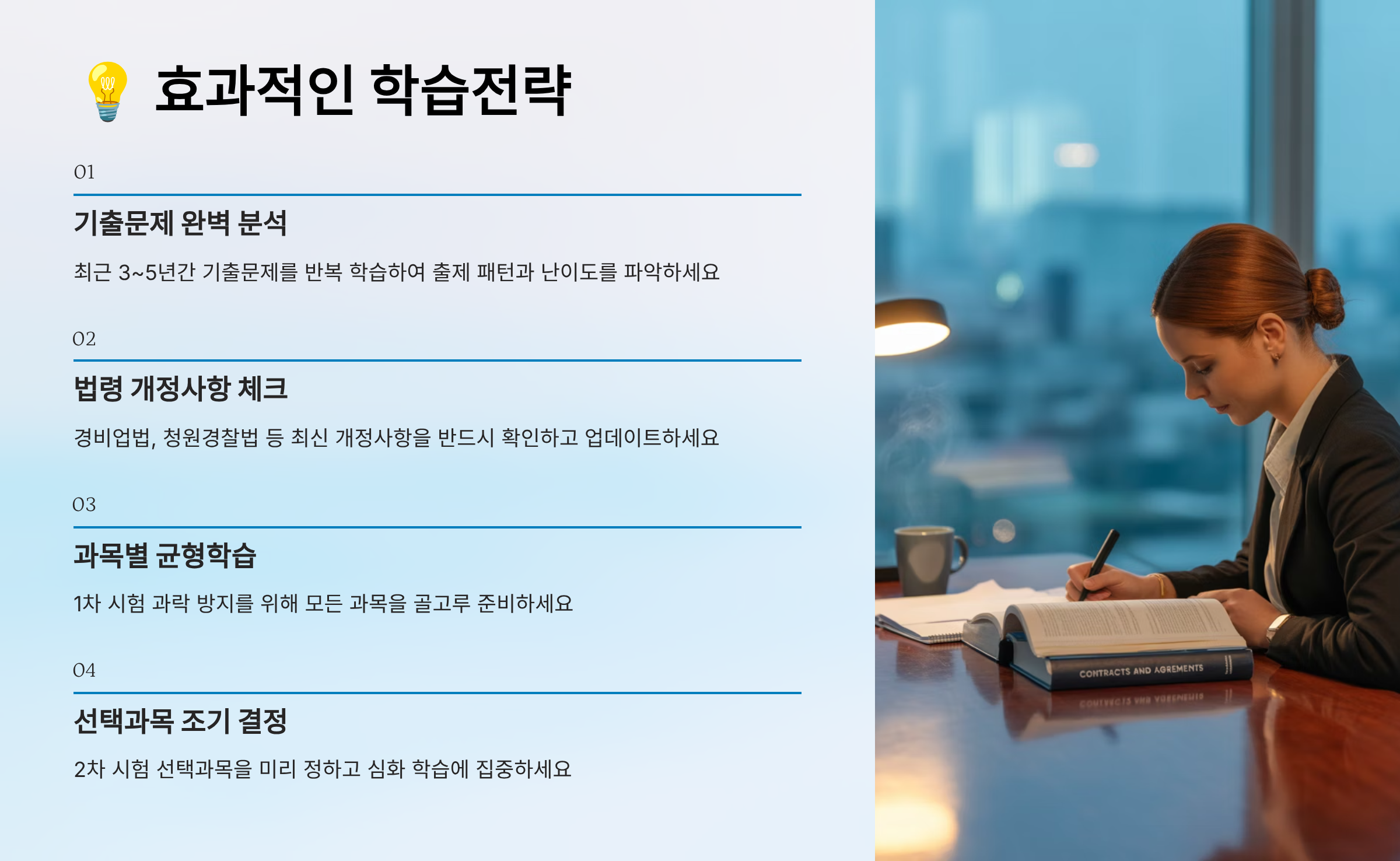 경비지도사 시험은 법학개론, 민간경비론, 경비업법 등 법률과 실무 지식이 결합된 시험입니다. 따라서 다음과 같은 준비 전략이 필요합니다.
