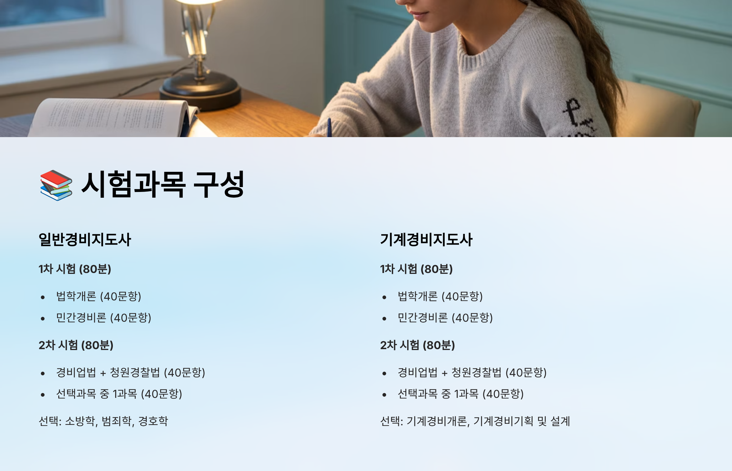 - 2차 시험: 경비업법(청원경찰법 포함) + 선택 1과목(기계경비개론, 기계경비기획 및 설계)
