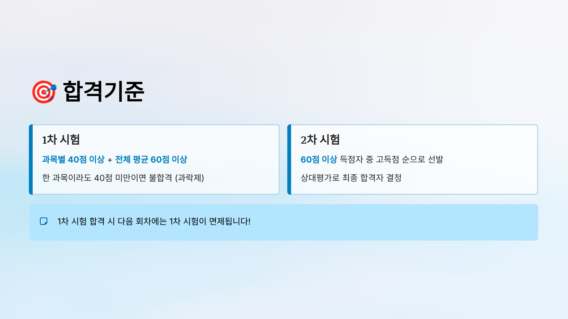 - 1차 시험: 과목별 40점 이상, 전체 평균 60점 이상일 경우 합격