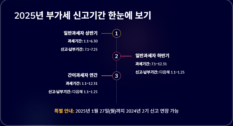 | 간이과세자 | 연 1회 | 전년도 7월 1일 ~ 당해 6월 30일 | 매년 1월 25일 | 소규모 자영업자 대상, 신고·납부 부담 완화 |