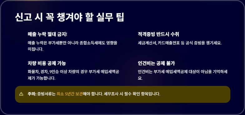 음식점을 운영하는 자영업자의 경우 카드·현금영수증 매출은 자동 전송되지만 현금 거래는 장부 기재가 필요합니다. 또한 매입세액 공제를 위해 세금계산서와 카드전표를 반드시 보관해야 합니다. 부가세 신고기간 직전에는 누락 매출이 없는지 반드시 점검하는 습관이 필요합니다.
