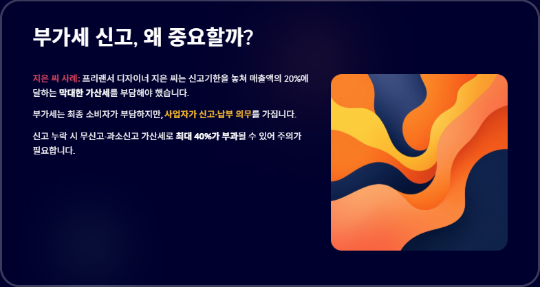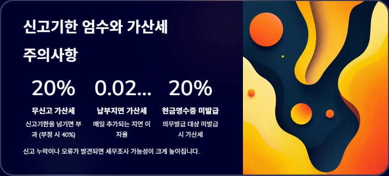 부가세 신고기간을 넘기면 무신고 가산세(20~40%)와 납부 불성실 가산세가 부과됩니다. 다만 일정 기간 내 신고 시 감면 혜택이 있습니다.
