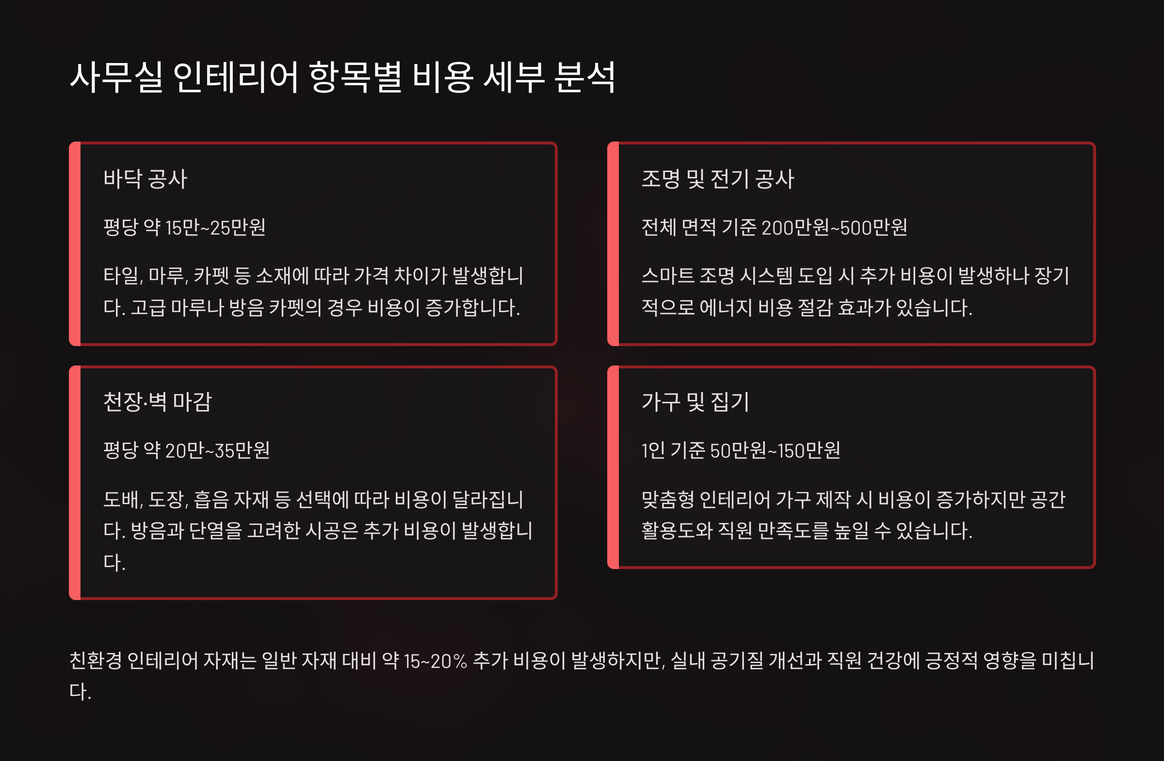 - 친환경 인테리어 자재 – 일반 자재 대비 약 15~20% 추가 비용