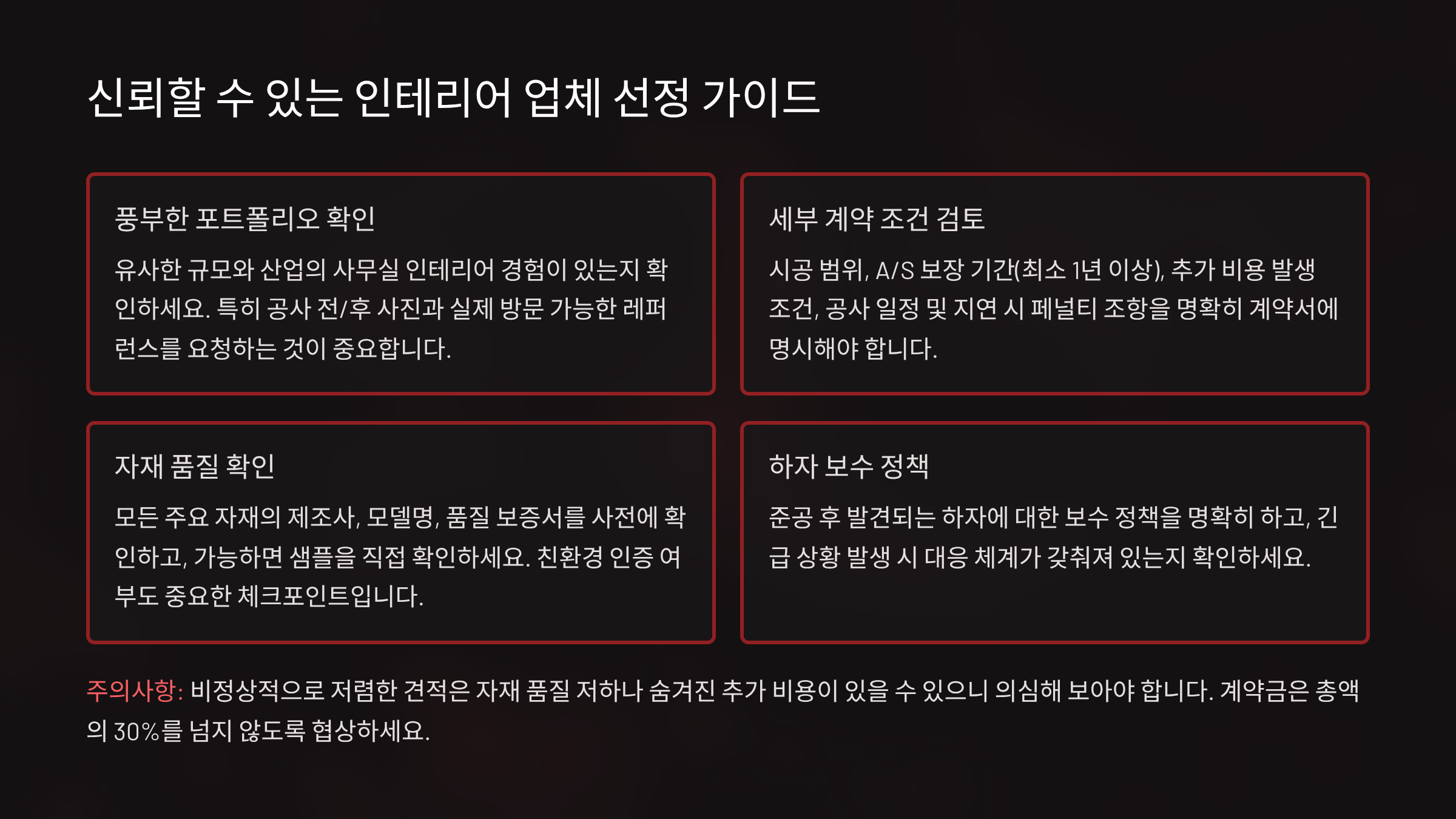 사무실 인테리어 성공의 핵심은 업체 선정입니다. 단순히 견적이 저렴한 곳보다, 경험과 포트폴리오가 풍부한 업체를 선택하는 것이 중요합니다. 또한 계약 전에는 반드시 시공 범위, A/S 보장 기간, 추가 비용 발생 조건을 꼼꼼히 확인해야 합니다.