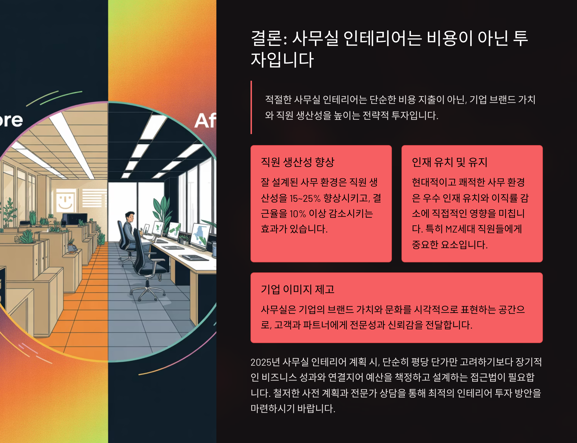 결론 – 사무실 인테리어 비용은 단순히 지출이 아니라 미래에 대한 투자입니다. 평당 단가, 항목별 비용, 절감 전략을 꼼꼼히 검토하면 합리적인 예산으로도 충분히 만족스러운 인테리어를 완성할 수 있습니다. 2025년 최신 사무실 인테리어 비용 정보를 참고해 기업의 브랜드 가치와 직원 만족도를 동시에 높여보시기 바랍니다.