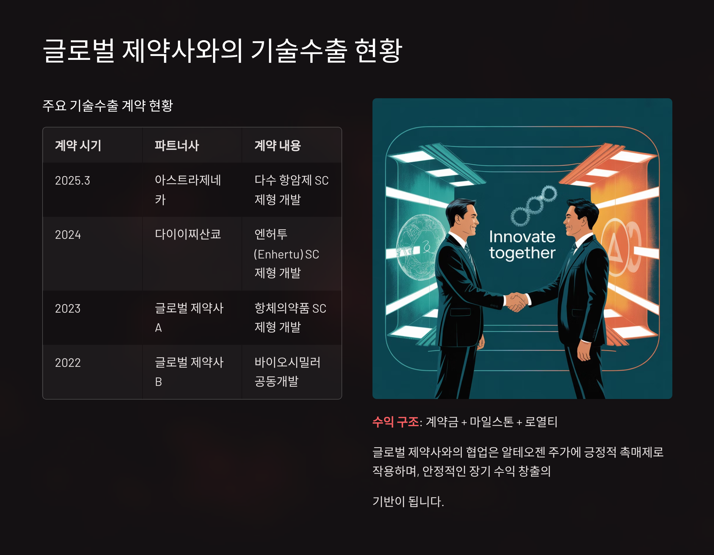 2025년 3월, 알테오젠은 아스트라제네카와 다수의 항암제 SC 제형 개발을 위한 글로벌 라이선스 계약을 체결했습니다 또한 2024년에는 다이이찌산쿄와 엔허투(Enhertu) SC 제형 개발 계약을 맺으며 국제적 신뢰도를 높였습니다 이러한 계약은 로열티와 마일스톤 수익으로 이어지며 알테오젠 주가 전망에 긍정적인 촉매제가 되고 있습니다.