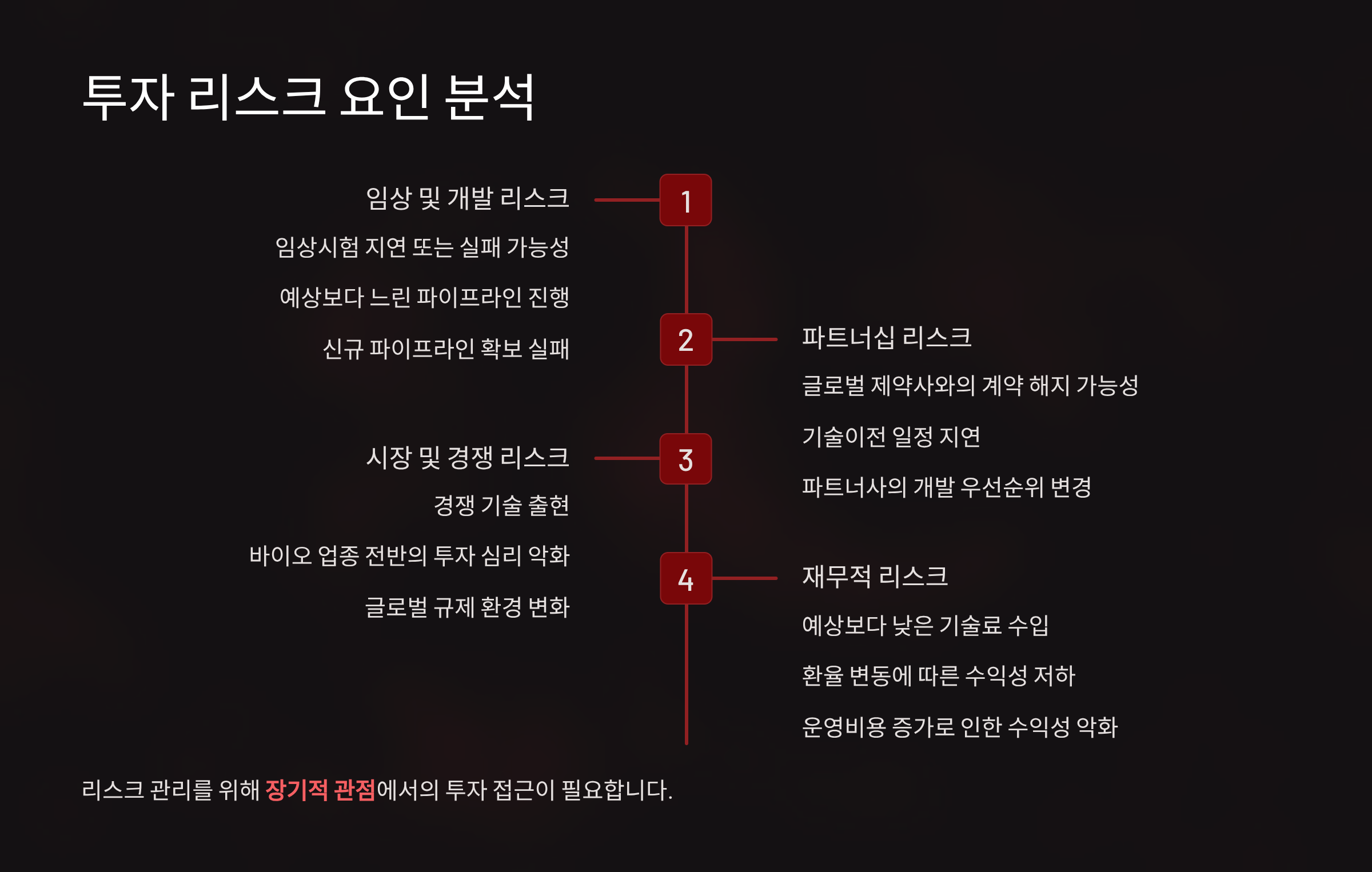 알테오젠 주가 전망이 긍정적이지만, 리스크도 존재합니다. 첫째, 임상 지연이나 파이프라인 실패 가능성이 있습니다. 둘째, 글로벌 제약사와의 협력에서 발생할 수 있는 계약 해지 또는 지연 리스크가 있습니다. 셋째, 바이오 업종 특성상 단기 변동성이 크기 때문에 장기적 관점에서 투자 접근이 필요합니다.