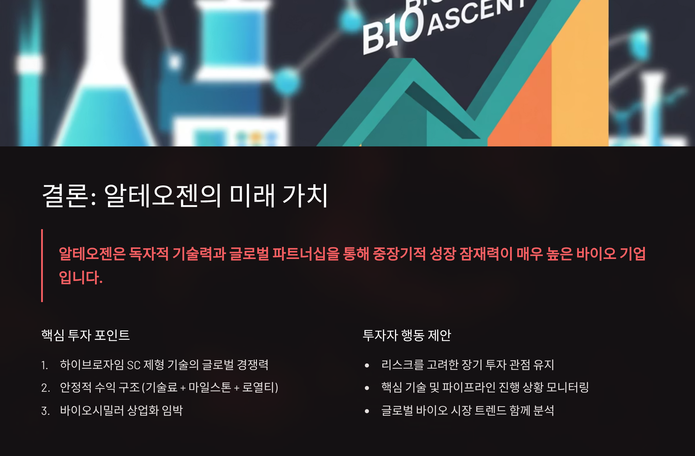 정리하면, 알테오젠은 ALT-B4 하이브로자임 SC 제형 기술과 ALT-L9 아일리아 바이오시밀러 성과를 통해 글로벌 바이오 시장에서 영향력을 확대하고 있습니다. 기술수출 계약과 특허 강화로 중장기 성장성이 유망하며, 2025년 알테오젠 주가 전망은 여전히 긍정적입니다. 투자자는 리스크를 관리하면서 장기적인 관점에서 알테오젠 주가 전망을 바라보는 것이 바람직합니다.