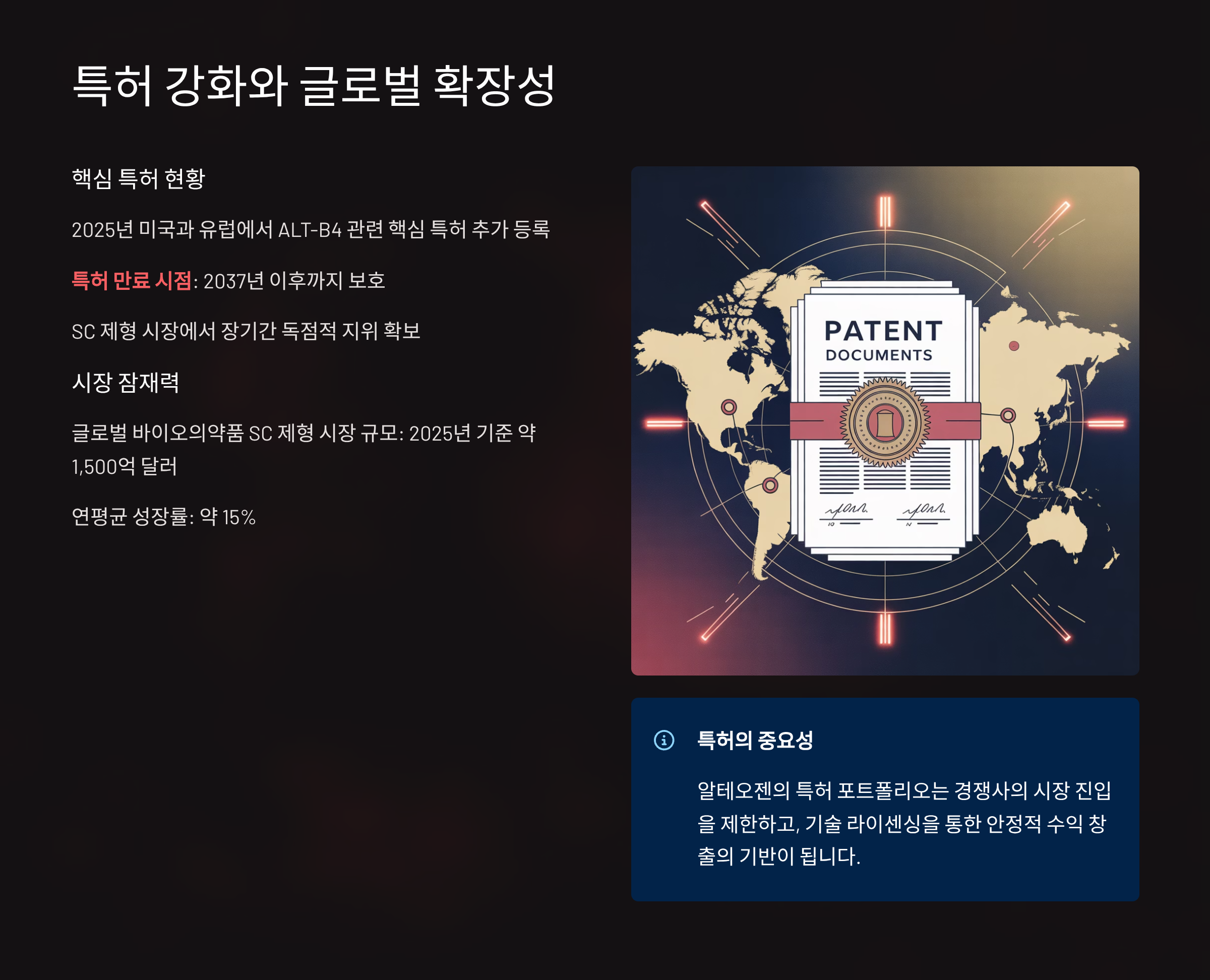알테오젠은 2025년 미국과 유럽에서 ALT-B4 관련 핵심 특허를 추가 등록하며 글로벌 경쟁력을 확보했습니다 이 특허는 향후 SC 제형 시장에서 장기간 독점적 지위를 유지할 수 있게 해줍니다. 글로벌 파트너사와의 확장된 계약과 더불어 안정적인 수익원이 될 수 있어 알테오젠 주가 전망에 긍정적인 영향을 줍니다.