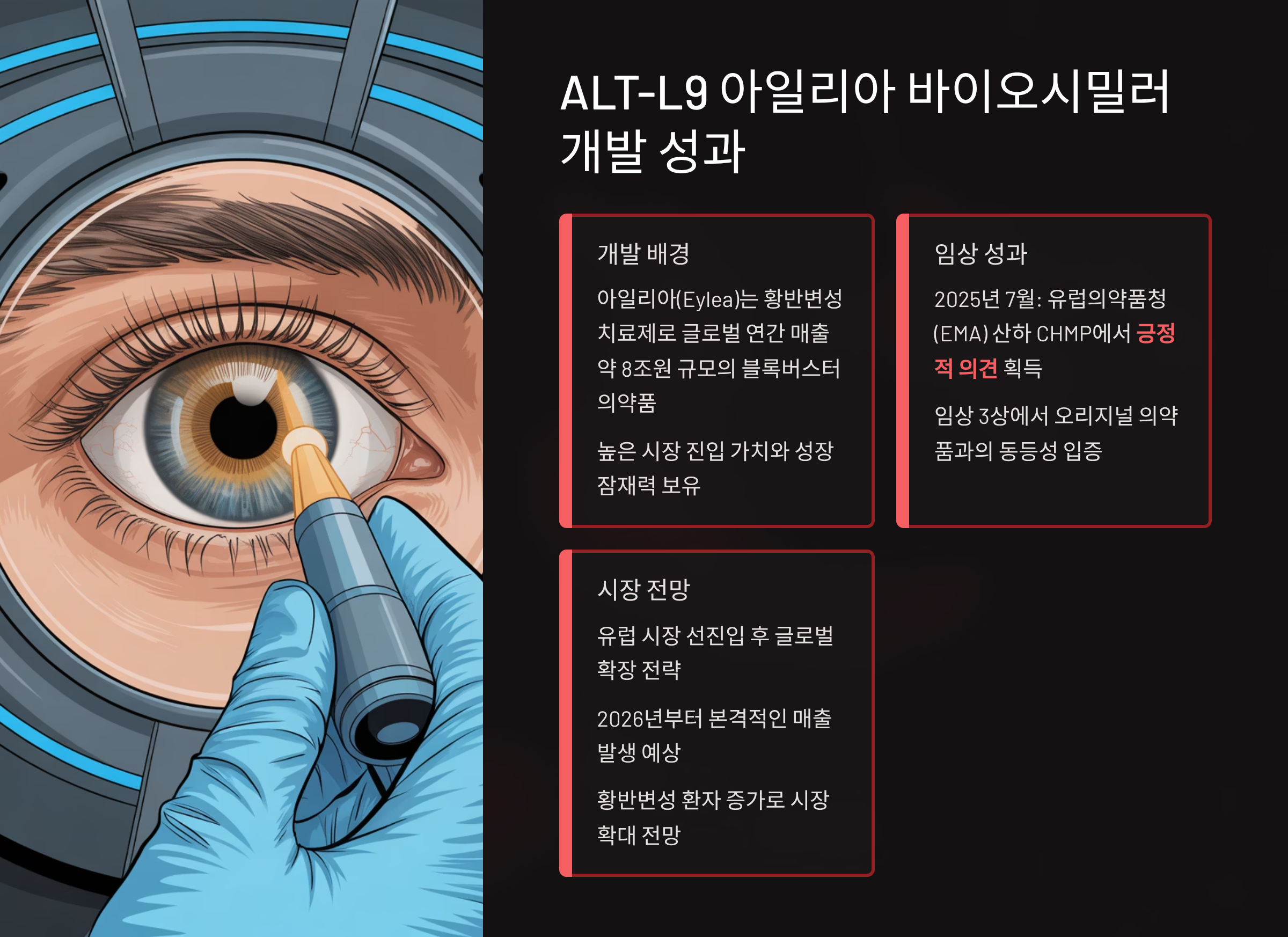 알테오젠은 ALT-L9이라는 아일리아(Eylea) 바이오시밀러 개발에서도 중요한 성과를 거두었습니다. 2025년 7월, 유럽의약품청(EMA) 산하 CHMP에서 긍정적인 의견을 받으며 상업화 기대감을 높였습니다 이는 글로벌 매출이 큰 황반변성 치료제 시장에 진출할 수 있는 기회를 의미하며, 알테오젠 주가 전망의 주요 성장 동력으로 꼽힙니다.
