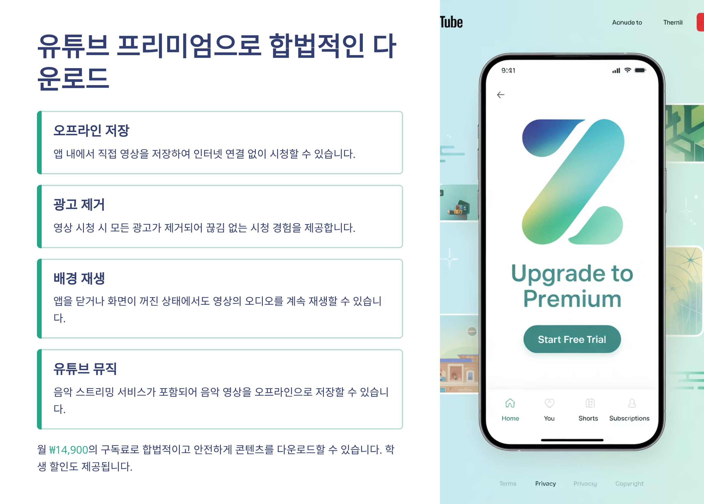가장 안전하고 합법적인 방법은 유튜브 프리미엄에 가입하는 것입니다. 월 구독료를 내면 광고 없이 영상을 감상할 수 있고, 앱 내 오프라인 저장 기능으로 영상을 다운로드해 네트워크 없이 감상할 수 있습니다. 특히 음악이나 강의를 자주 보는 분들에게 안정적이고 합법적인 방법이 됩니다.