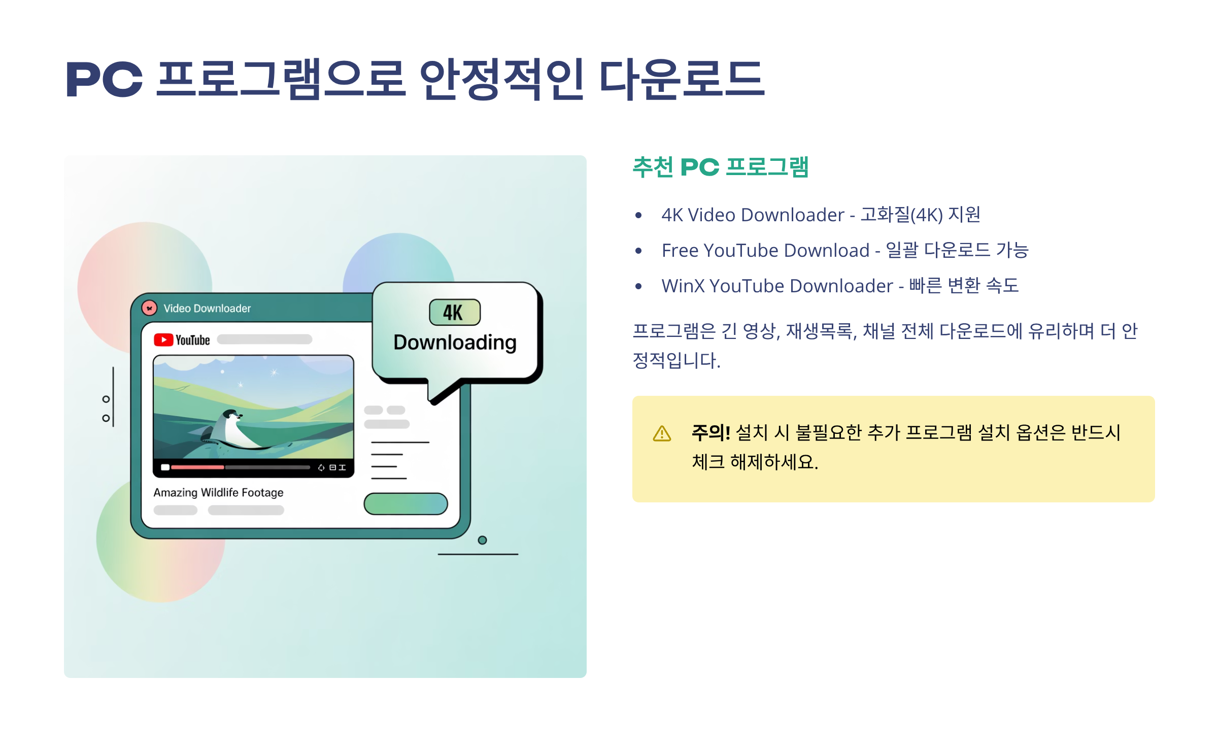 온라인 사이트보다 안정적으로 다운로드하려면 PC 프로그램을 활용할 수 있습니다. 4K Video Downloader, Free YouTube Download 같은 프로그램은 무료 버전도 제공하며, 고화질 영상(1080p, 4K)까지 저장 가능합니다. 특히 강의나 다큐멘터리 같이 긴 영상을 저장할 때 안정적입니다. 단, 프로그램 설치 시 불필요한 추가 프로그램 설치 옵션을 체크 해제하는 것이 안전합니다.