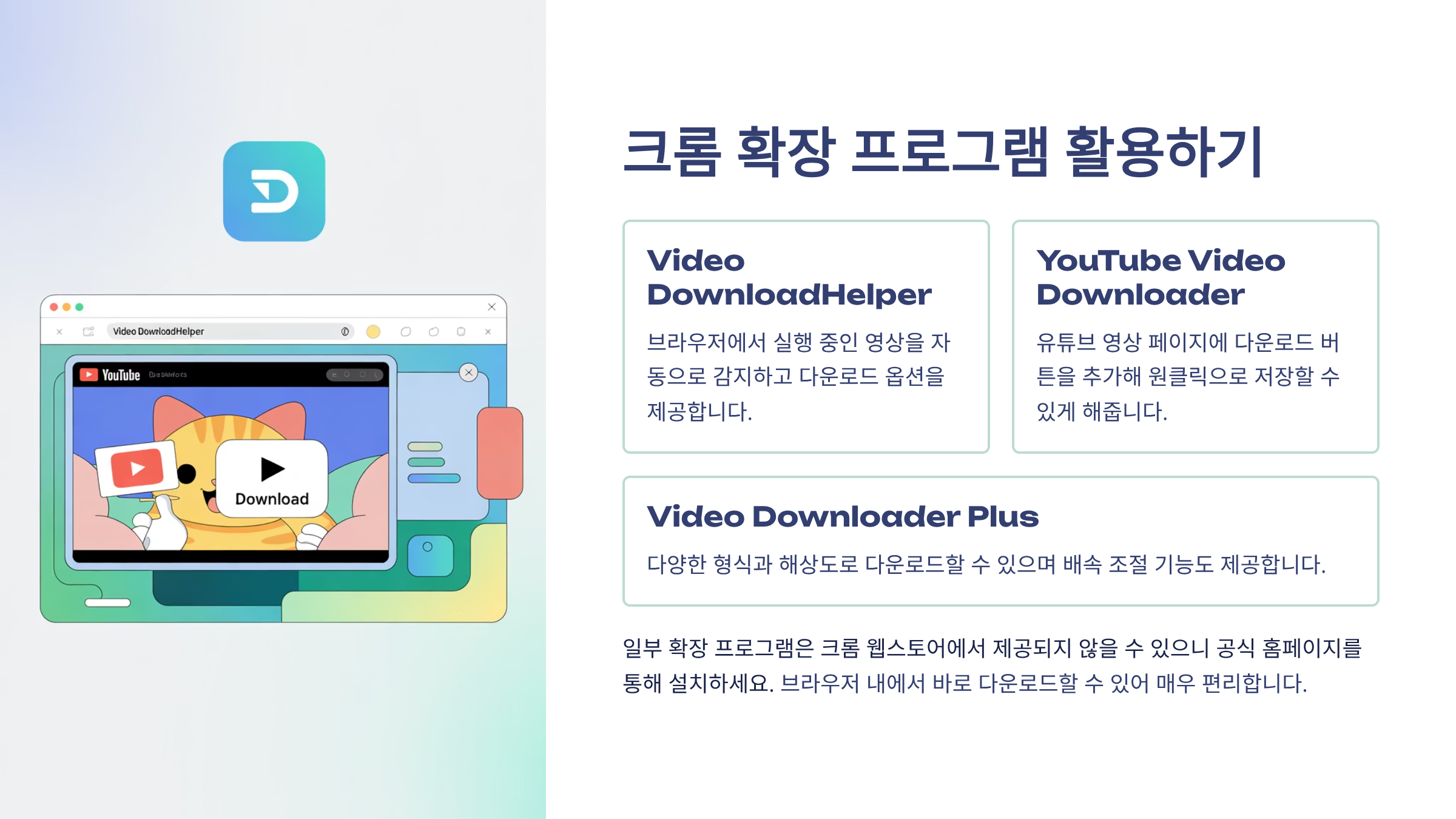 브라우저에서 바로 유튜브동영상을 저장하고 싶다면 크롬 확장 프로그램을 활용하는 방법도 있습니다. 예를 들어 Video DownloadHelper 같은 확장 프로그램은 브라우저 내에서 실행되는 영상을 자동으로 탐지하고 저장 버튼을 제공합니다. 다만, 구글 크롬 정책에 따라 일부 확장 프로그램은 크롬 웹스토어에서 직접 제공되지 않으므로 공식 홈페이지를 통해 다운로드해야 합니다.
