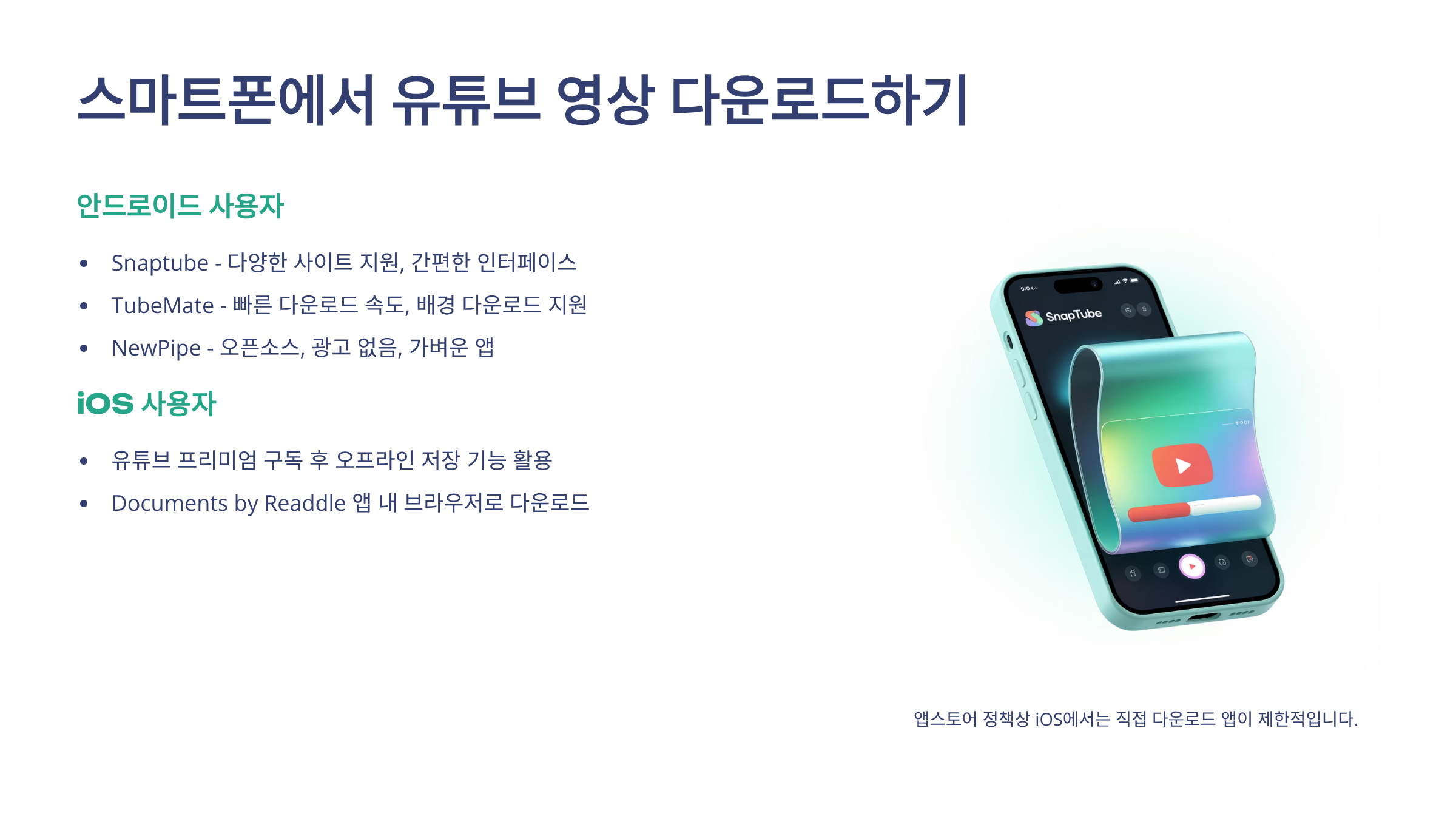 스마트폰에서는 앱 설치를 통해 유튜브 영상을 다운로드할 수 있습니다. Snaptube, TubeMate 같은 앱이 대표적이며, 안드로이드 기기에서 많이 사용됩니다. 단, 구글 플레이 스토어에서 제공되지 않는 경우가 많으므로 공식 사이트에서 설치 파일을 받아야 합니다. 아이폰 사용자의 경우 앱스토어에서 직접 다운로드는 어렵지만, 유튜브 프리미엄 오프라인 저장 기능을 활용할 수 있습니다.