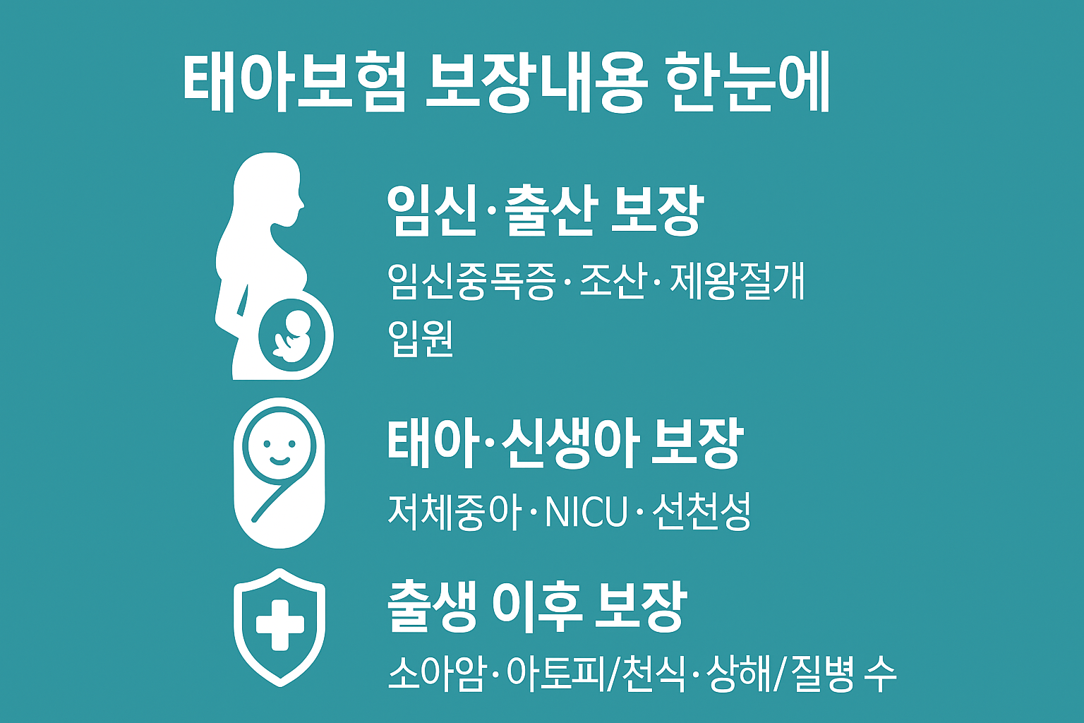 - 태아·신생아 보장: 저체중아 출생, 신생아 집중치료실(NICU) 입원비, 선천성 질환 치료비.