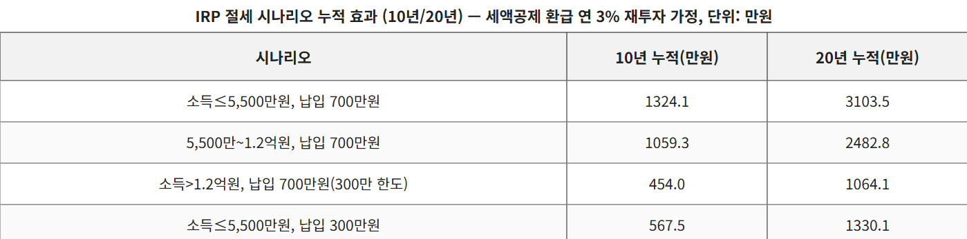 예시) 소득 5,000만원, IRP 700만원 납입 시 약 115.5만원 세액공제. 공제액은 IRP 계좌에 재투자해 복리 효과를 노리면 IRP 수익률 향상에 간접적으로 기여합니다.
