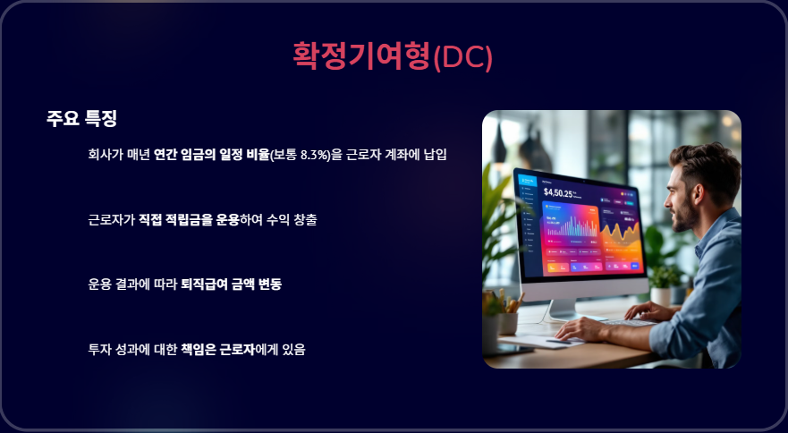 | 확정기여형(DC) | 회사 납입액 확정, 운용성과 따라 수령액 변동 | 근로자 | 회사 부담금(연봉 1/12)+운용수익 |