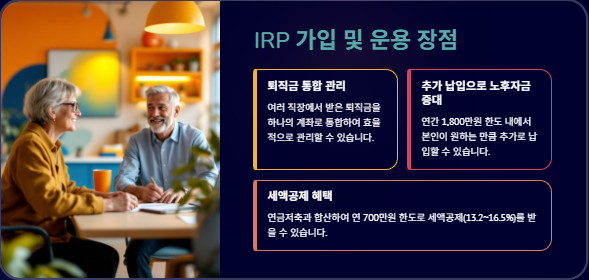 개인형 IRP(Individual Retirement Pension)는 퇴직금과 추가자금을 적립해 55세 이후 연금 또는 일시금으로 수령하는 제도입니다. 직장인(DB·DC·기업형IRP 가입자)은 물론 자영업자·프리랜서·공무원 등 소득이 있는 누구나 개설할 수 있습니다. 300만원 초과 퇴직금 및 55세 미만 퇴직자의 경우 IRP로 이전하는 흐름이 표준이 되었고, 노후자금 준비와 IRP 세금혜택을 동시에 노릴 수 있습니다.