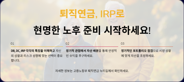 퇴직연금(IRP)은 세액공제·연금과세 감면·다양한 상품운용을 동시에 활용하는 2025년 노후재테크의 중심 도구이며, 퇴직연금 종류(DB형·DC형·IRP)를 이해하고 개인 상황에 맞춰 IRP 계좌를 전략적으로 운영하면 노후자금의 안정성과 성장성을 함께 확보할 수 있습니다.