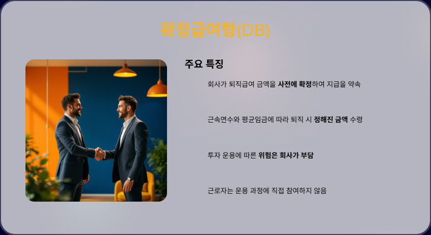 | 확정급여형(DB) | 퇴직 전 평균임금×근속연수 등 회사 규정에 따라 지급액 확정 | 회사 | 사전 확정 급여 |