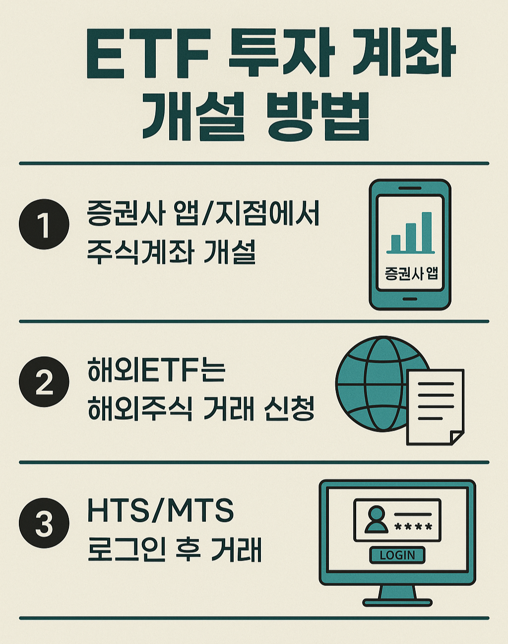 ETF 투자를 시작하려면 주식계좌가 필요합니다. 증권사 지점 방문 또는 MTS/HTS로 비대면 계좌 개설이 가능하며, 해외ETF 매매는 별도 해외주식 거래 신청이 필수입니다.