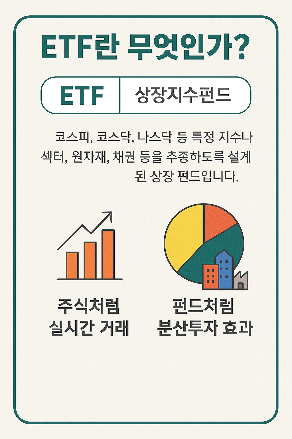 ETF(Exchange Traded Fund)는 코스피, 코스닥, 나스닥 등 특정 지수나 섹터, 원자재, 채권 등을 추종하도록 설계된 상장형 펀드입니다. 주식처럼 거래소에서 실시간 매매 가능하며, 다양한 종목에 분산투자 효과를 줍니다.
